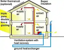 - En dehors des États-Unis et du Canada, une ZEB est généralement définie comme « Net zero energy emissions », également connue sous le nom de « zero carbon building » ou « zero emissions building » Selon cette définition, les émissions de carbone générées par l'utilisation de combustibles fossiles sur site ou hors site sont équilibrées par la quantité de production d'énergie renouvelable sur site. D'autres définitions incluent non seulement les émissions de carbone générées par le bâtiment considéré, mais aussi celles générées dans la construction du bâtiment et l'énergie intrinsèque de la structure. Il y a débat sur la question de savoir si les émissions de carbone des trajets vers et depuis le bâtiment doivent également être inclus dans le calcul. Des travaux récents en Nouvelle-Zélande ont entrepris une démarche visant à intégrer l'énergie du transport utilisateur dans l'enveloppe de la construction à énergie zéro[10].