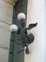 La façade d'angle est dominée par un dôme surmonté d'une statue dorée de Mercure, le dieu du commerce, avec des chaussures ailées et portant un pétase et un caducée, œuvre du sculpteur Đorđe Jovanović[3] ; pour cette raison, pour préciser une direction, les vieux habitants de Novi Sad se réfèrent à lui en indiquant « l'angle de la rue avec l'homme d'or »[5]. À l'angle des rues Grčkoškolska et Miletićeva, le portail possède des vantaux en fer forgé avec des motifs rocaille stylisés et portant les initiales CKZ (Centralni kreditni zavod) en ligature ; l'entrée est encadrée de hauts vases de pierre et de colonnes supportant une balustrade épousant la courbe de la façade d'angle ; après la balustrade, des colonnes engagées aux chapiteaux composites, soulignent la verticalité de l'ensemble, déjà mis en valeur par le couronnement du dôme[2].