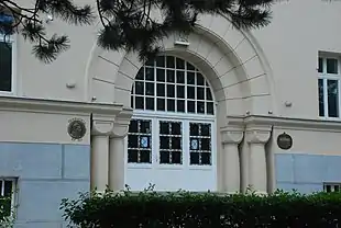 Dans des champs carrés situés entre les deuxième et troisième étages de l'avancée centrale figurent sept médaillons avec des bustes en relief représentant Vuk Karadžić (1787-1864), le grand réformateur de la langue littéraire serbe, Saint Sava (mort en 1236), le fondateur de l'Église orthodoxe serbe, Bora Stanković (1876-1927), un écrivain et novelliste serbe, Ivan Mažuranić (1814-1890), poète, linguiste et homme politique croate, France Prešeren (1800-1849), un poète slovène, Ivan Gundulić (1589-1638), un poète de la république de Raguse, et Petar Petrović Njegoš (1813-1851), poète, philosophe et prince-évêque du Monténégro[2] ; ces reliefs sont l'œuvre du sculpteur Marko Brežanin (1885-1956), qui a voulu souligner le caractère « yougoslave » du système scolaire moderne en Serbie[2].