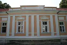 La façade sur rue est caractéristique du style néo-classique, notamment par la décoration plastique autour des fenêtres et par les pilastres qui les séparent. Quatre avancées régulièrement disposées rythment l'ensemble dont deux disposent d'un portail avec un escalier, les deux autres étant dotées de simples fenêtres[réf. nécessaire].