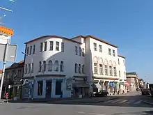 Le bâtiment, situé 1 rue Maksima Gorkog à l'angle de trois rues, est connu comme la « Maison des commerçants de Jagodina » (en serbe : Dom jagodinskih trgovaca). Il a été construit en 1931 dans un style influencé par celui de l'architecture serbo-byzantine selon un projet de Momir Korunović[2].