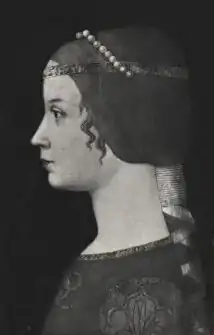 Le Muralto la présente comme «d'un jeune âge, belle et aux cheveux couleur de corbeau»[75]. Nous savons qu’elle était de petite taille et qu’elle portait donc des talons pour réduire la différence de hauteur avec son mari. Au musée international de la chaussure de Vigevano se trouve d’ailleurs un plan d’étage datant de la fin du XVe siècle attribué précisément à la duchesse[76], qui, compte tenu de sa taille, devait mesurer 34 à 35 pieds[77].