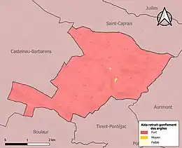 Le retrait-gonflement des sols argileux est susceptible d'engendrer des dommages importants aux bâtiments en cas d’alternance de périodes de sécheresse et de pluie. La totalité de la commune est en aléa moyen ou fort (94,5 % au niveau départemental et 48,5 % au niveau national). Sur les 65 bâtiments dénombrés sur la commune en 2019, 65 sont en aléa moyen ou fort, soit 100 %, à comparer aux 93 % au niveau départemental et 54 % au niveau national. Une cartographie de l'exposition du territoire national au retrait gonflement des sols argileux est disponible sur le site du BRGM[20],[Carte 3].
