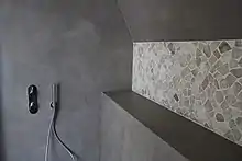 - le Tadelakt (Maroc) à base de chaux va se trouver utilisé dans les pièces d'eau et parfois les sols. Ce matériau est fermé au galet lors de sa prise pour réduire sa porosité et traité au savon noir régulièrement.