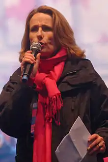 Béatrice Bourges est la porte-parole du Printemps français, un mouvement contestataire issu de La Manif pour tous et classé entre la droite et l'extrême droite[26].