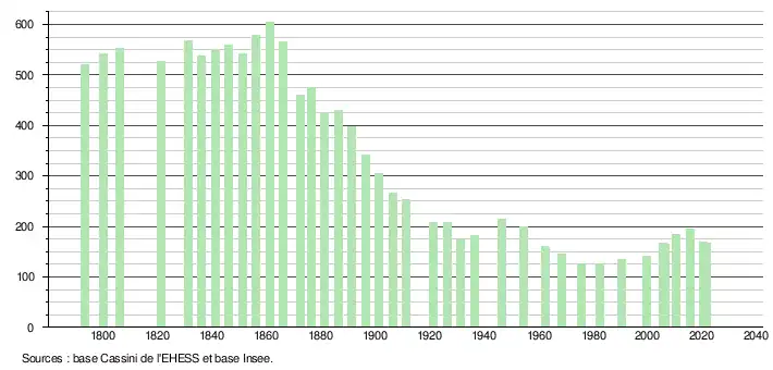 L'évolution du nombre d'habitants est connue à travers les recensements de la population effectués dans la commune depuis 1793. Pour les communes de moins de 10 000 habitants, une enquête de recensement portant sur toute la population est réalisée tous les cinq ans, les populations légales des années intermédiaires étant quant à elles estimées par interpolation ou extrapolation[16]. Pour la commune, le premier recensement exhaustif entrant dans le cadre du nouveau dispositif a été réalisé en 2005[17].
