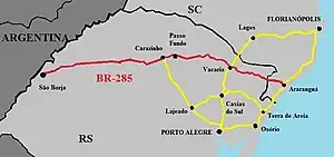 La BR-285 est une route transversale qui commence à Araranguá, État de Santa Catarina, et s'achève à São Borja, Rio Grande do Sul. Elle est en relativement bon état jusqu'à Timbé do Sul (Santa Catarina), mais en terre jusqu'à la limite avec le Rio Grande do Sul. Elle redevient en bon état sur le territoire de ce dernier. Elle comporte deux tronçons sous concession de compagnies privées, entre Vacaria et Lagoa Vermelha - 66 km — et Passo Fundo et Panambi - 120 km. Entre Bom Jesus et Vacaria, elle porte le nom populaire de "Rodovia da Maçã" (Route de la Pomme).