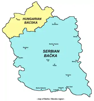 Il est à signaler que les parties hongroises de la Bácska appartiennent aussi aux sous-régions de Kiskunhalasi et Mohácsi, même si l'essentiel de ces sous-régions ne fait pas partie de la Bácska.