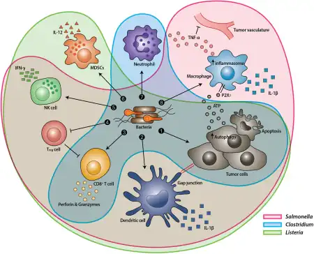 - La bactérie Salmonella tue les cellules tumorales par multiplication bactérienne incontrôlée qui peut conduire à l'éclatement des cellules cancéreuses. De plus, les macrophages et les cellules dendritiques (type de globules blancs) de ces tumeurs colonisées par Salmonella sécrètent de l'interleukine IL-1β, une protéine responsable de l'activité anti-tumorale[10].