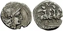 Denarius de Cnaeus Baebius Tamphilus frappé entre 194 et 190 av. J.-C. avec les Dioscures au revers et la mention TAMP pour Tamphilus.