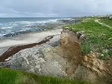 Le recul des falaises de micaschistes au nord de Penhors est aussi important, d'où l'existence d'une plate-forme d'abrasion découvrant à marée basse, large par endroits de plusieurs centaines de mètres ; depuis la fin du XVIIIe siècle le recul du trait de côte atteint jusqu'à 58 mètres dans le secteur de Penhors et 47 mètres à hauteur de Palud Pellan. Les cordons d'enrochement entrepris afin de stabiliser le trait de côte, surtout le long du littoral de Pouldreuzic, et à un degré moindre de Plozévet, contribuent à tarir le réapprovisionnement en galets (provenant de galets fossiles datant du pléistocène qui sont abondants dans les plages soulevées situées en sommet de falaise) de l'Ero Vili[39].