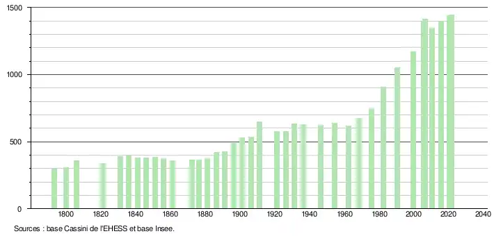 L'évolution du nombre d'habitants est connue à travers les recensements de la population effectués dans la commune depuis 1793. Pour les communes de moins de 10 000 habitants, une enquête de recensement portant sur toute la population est réalisée tous les cinq ans, les populations légales des années intermédiaires étant quant à elles estimées par interpolation ou extrapolation[20]. Pour la commune, le premier recensement exhaustif entrant dans le cadre du nouveau dispositif a été réalisé en 2005[21].