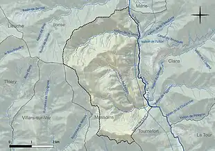 Village perché de la vallée de la Tinée[1], construit à 830 mètres d'altitude, sur une arête rocheuse, dominé par la Pointe des Quatre Cantons[2],[3].