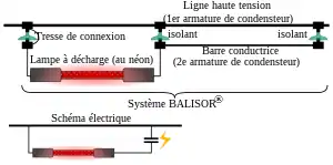 Dès lors, un second conducteur de quelques mètres de longueur, isolé mais parallèle au câble haute tension, aura donc un potentiel différent de celui de la ligne. L'ensemble constitue un condensateur dont la particularité est d'être chargé à travers l'air (fuites à travers son diélectrique).