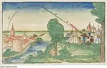 Traitant du problème de la dynamique d'un projectile, Jean Buridan (1292-1363) montre que la théorie d'Aristote du mouvement est prise à défaut et remet au goût du jour l'impetus, théorie de Jean Philopon dont il devient le principal promoteur. L'application par Buridan de la théorie de l'impetus au mouvement des projectiles le conduit à une courbe balistique différente de celle donnée par la théorie aristotélicienne. Ce problème a été étudié de manière plus approfondie par un autre savant parisien, Albert de Saxe (1316-1390), qui a distingué trois étapes différentes dans le mouvement des projectiles. Tout d'abord, une étape initiale dans laquelle l'impetus est dominante, et la gravité est considérée comme négligeable, le résultat étant un mouvement en ligne droite. Albert de Saxe définit une étape intermédiaire dans laquelle la gravité se rétablit, et le chemin commence à s'écarter de la ligne droite ; Cette partie du chemin est souvent conçue comme faisant partie d'un cercle. Troisièmement, il postule une étape finale où l'impetus est complètement dépensée, et la gravité seule entraîne le projectile vers le bas le long d'une ligne verticale. La théorie de l'impetus a entraîné une forme améliorée de la courbe balistique, bien que dans un sens purement qualitatif, d'où il aurait été impossible d'en déduire des tableaux de portée de valeur pratique[8].