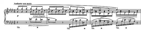 la valse lente du premier thème et des variations : thème I en fa mineur, mesures 7 à 22, variation I, mesures 23 à 36, et variation II, mesures 58 à 71. Le deuxième thème, thème II à la sous-dominante de si bémol majeur, mesures 80 à 99, Le deuxième thème pastoral est un croisement entre une barcarolle et un choral. Il est suivi d'un épisode dans lequel la tonalité passe en la bémol majeur. Le retour de l'introduction, dans une tonalité inattendue, est musicalement un moment de grand pathos. Comme l'écrit Samson : « Le voyage entre ce point et la reprise [du thème II] est l'un des passages les plus magiques de Chopin. Les principaux fils du Thème I sont ici isolés et présentés en combinaison contrapuntique ... De plus, l'un de ces brins est progressivement et magnifiquement transformé en un retour discret de l'introduction dans la région éloignée de premier plan de La majeur, une transition rendue possible par les notes répétées communes de l'introduction et du Thème I. C'est le point central de la structure [et] permet à sa reprise de commencer dans la tonalité inattendue de Ré mineur. »[11],[12].