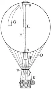 A Orifice et mécanisme de remplissage, B Évent, C Commande d'éventage, D Suspentes nacelle, E Anneau de panier, F Commande du mécanisme de remplissage, G Panneau de déchirure, H Commande de déchirure, K Ligne de traîne.