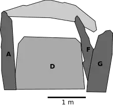 Le dolmen vu du nord. Sur la droite, la dalle de chevet, fendue.