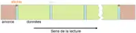 Les premiers mètres de bande sont appelés l'« amorce ». L'amorce est terminée par une étiquette réfléchissante (appelée « sticker ») collée sur la bande. Un dispositif de détection photoélectrique sur le dérouleur de bandes détecte cette étiquette qui délimite le début de la zone de données et termine l'étape de « chargement » de la bande. Une seconde étiquette est positionnée à la fin de la bande, et marque la fin de la zone de données. Afin de distinguer les deux, le sticker de début de bande est situé sur la partie supérieure de la bande tandis que celui de fin de bande est situé sur la partie inférieure. Typiquement, quand celle-ci est détectée par le lecteur, il rembobine la bande automatiquement.