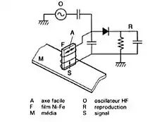 - mode lecture. Lorsqu'une zone magnétique de la bande passe à proximité de l'électroaimant, il se forme un courant électrique dans le bobinage. Ce courant est ainsi détecté et permet de savoir quelles sont les informations enregistrées sur cette bande.