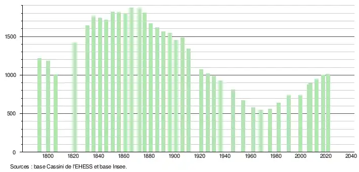 | L'évolution du nombre d'habitants est connue à travers les recensements de la population effectués dans la commune depuis 1793. Pour les communes de moins de 10 000 habitants, une enquête de recensement portant sur toute la population est réalisée tous les cinq ans, les populations légales des années intermédiaires étant quant à elles estimées par interpolation ou extrapolation[28]. Pour la commune, le premier recensement exhaustif entrant dans le cadre du nouveau dispositif a été réalisé en 2007[29]. En 2021, la commune comptait 1 010 habitants[Note 6], en augmentation de 2,96 % par rapport à 2015 (Morbihan : +3,21 %, France hors Mayotte : +1,84 %). |