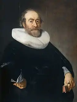 En 1609, désireux de remédier à cette situation, le conseil de la ville d’Amsterdam ouvrit une banque dans l’enceinte de l’hôtel de ville. Selon Lucien Gillard, l’objectif des autorités n’était pas de faire des bénéfices mais de remettre de l’ordre dans la monnaie pour restaurer la confiance[9]. Cette banque était régie par des officiers assermentés, caissiers, employés aux écritures et à la comptabilité, gardes du trésor, sous l’autorité des édiles d’Amsterdam. Les trois commissaires (commissarissen) de la Wisselbank étaient renouvelés tous les ans, mais leur liste chronologique montre les mêmes noms revenant régulièrement. Les trois premiers furent Frans Henricksz Oetgens van Waveren, Dirck Jacobsz Bas[10] (Dr Dirck Bas, 1569-1637) et Dirk de Vlaming van Oudshoorn[11] (1574-1642). Ce dernier, membre de la noblesse, faisait partie du conseil municipal lors de la création de la banque et fut maire d’Amsterdam en 1630 et 1642[12].