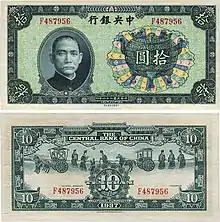 En novembre 1935, la Banque centrale de Chine retire officiellement le pays de l'étalon-argent. Cette décision a également rendu les billets de banque de la Banque centrale de Chine légaux et fait de la monnaie chinoise une monnaie fiduciaire, ce donne au gouvernement nationaliste chinois le contrôle total de la quantité de monnaie circulant en Chine[22].