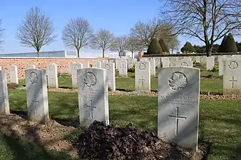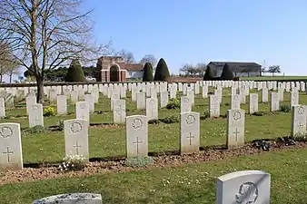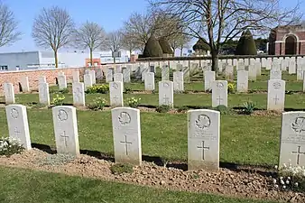 Le cimetière contient maintenant 410 sépultures et commémorations de la Première Guerre mondiale dont 181 ne sont pas identifiées.