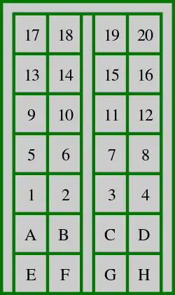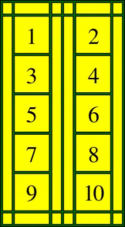 La porte est subdivisée en dix grands carrés, disposés sur cinq rangées, dont chacun, avec des encadrements ornés de cocardes à têtes de prophètes, occupe toute la largeur d'un vantail. Les panneaux montrent des scènes de l'Ancien Testament[7].