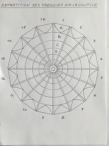 Les fresques de la coupole se répartissent de la façon suivante (là aussi la numérotation commence au secteur où se trouve l’autel) :