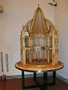 Afin de bien comprendre de quoi il s’agit, il convient de noter que le baptistère a la particularité de posséder deux couvertures : une première tronc-pyramidale à base dodécagonale qui n’est visible que de l’intérieur et une seconde semi-sphérique, qui coiffe la première. La maquette du baptistère (photo ci-après) réalisée en tilleul par Giancarlo Geri en 1990 et qui se trouve au museo dell’Opera del Duomo de Pise, met en évidence la conformation originale de cette double couverture. Seule la couverture intérieure correspond certainement au projet de Diotisalvi.