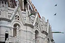 Ceci témoigne semble-t-il d’une volonté de radicale modification des plans de Diotisalvi, dans le but de surélever la galerie et par là, de donner un nouvel élan à l’ensemble[15]. La contribution de Nicola à la décoration extérieure est par contre bien plus identifiable. Il réalisa sur la galerie extérieure déjà implantée par Diotisalvi, une arcature à claire-voie de 60 arcades sur colonnettes, surmontées de gables et de pinacles, eux-mêmes décorés de bustes. Des têtes décorent également la base des arcades.