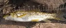 Il s'en distingue aussi par de plus grandes écailles, une nageoire anale très longue, une coloration dorée ponctuée de noir et surtout par l'absence totale de denticulations sur le dernier rayon dur de la nageoire dorsale, elle-même de profil convexe.