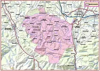 Définies comme région naturelle ou encore pays traditionnel [2], les Baronnies sont situées au sud d'une ligne Lannemezan - Bagnères-de-Bigorre. Bien que son noyau soit constitué à l'origine des 4 communes de l'ancienne baronnie d'Esparros, il est admis de nos jours qu'elle s'étend sur 26 communes (depuis 2018) : Argelès-Bagnères, Arrodets, Asque, Avezac-Prat-Lahitte, Banios, Batsère, Benqué-Molère, Bettes, Bonnemazon, Bourg-de-Bigorre, Bulan, Castillon, Esconnets, Escots, Esparros, Espèche, Espieilh, Fréchendets, Labastide, Laborde, Lies, Lomné, Marsas, Sarlabous, Tilhouse, Uzer.