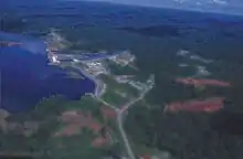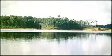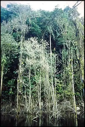 - en amont, à cause des effets différés dans le temps de l'insularisation écologique et de la fragmentation forestière (étudiée par le CNRS et le muséum à partir de la station scientifique de Saint-Eugène[44], sur le bord de la rivière Koursibo, l'un des nombreux affluent du Sinnamary[45]) induite par la montée de l'eau, et à cause de la difficulté de remontée pour les espèces aquatiques (migratrices ou non) ;