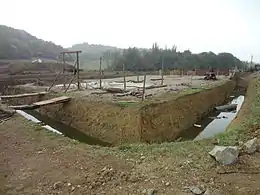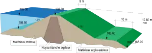 Le projet de barrage est constitué d'une digue en terre formée par un noyau étanche épais en argile, rechargé en amont par des matériaux granulaires de carrière recouverts d'une couche de cailloux de classe granulométrique 50/350 mm et en aval par des matériaux limono-sableux recouverts par une couche de terre végétale enherbée, qui protégerait le talus contre les effets érosifs du ruissellement des eaux de pluie[7]. La hauteur du barrage serait de 12,80 m pour une longueur de crête de 315 m et une largeur de 5 m. Le volume du remblai serait de 145 000 m3 dont 43 000 m3 de matériaux de carrière[37].