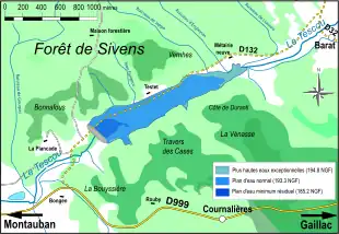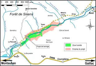 Bassin-versant du Tescou, avec situation de la retenue de Thérondel et du projet de barrage de Sivens.