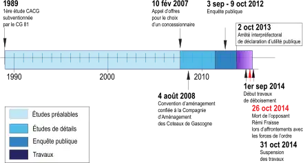Au cours de la manifestation du 26 octobre 2014, des affrontements entre les forces antiémeutes et un groupe de manifestants conduisent à la mort de l'un d'entre eux, après laquelle le projet est suspendu[3] et des manifestations se déroulent en hommage à l'opposant décédé, Rémi Fraisse, et contre les violences policières. Une nouvelle mission de médiation est alors lancée par le ministère de l’Écologie et du développement durable le et rend ses conclusions en [réf. nécessaire].