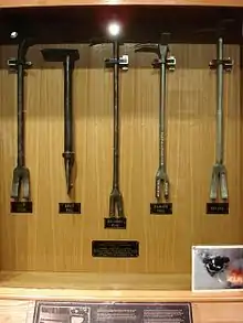 Une barre Halligan et une hache à tête plate peuvent être jointes ensemble et partiellement imbriquées tête au pied pour former ce qui est connu comme le « lot des fers » ou « The Irons » (« Les Fers »). Cette combinaison des outils est la plus commune au sein des services d'incendie et de secours. Cependant, la Halligan peut également être combinée avec un crochet Halligan (en) ou une masse.