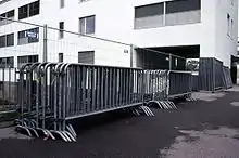 La barrière de police, composée d'un cadre et de barreaux verticaux, empêche le passage des individus, véhicules ou matériels. Construite en acier galvanisé, elle est très utilisée lors des événements (concerts, manifestation, etc.) pour canaliser les individus.