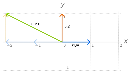 La géométrie plane, celle d'Euclide, peut comporter une approche algébrique, celle de Descartes. En utilisant les coordonnées cartésiennes, on peut identifier un vecteur du plan à un couple de réels. Par exemple, la figure montre comment placer le vecteur . On se sert alors des deux vecteurs de référence (dessinés en violet et rouge) pour le dessiner. Ainsi, tous les vecteurs du plan peuvent être exprimés de manière unique en termes de nombres vis-à-vis de deux vecteurs de référence. Ces deux vecteurs sont appelés base canonique du plan. En les notant respectivement et , un vecteur quelconque du plan s'exprime comme combinaison linéaire de ces deux vecteurs :