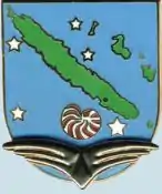 - la carte de l’archipel de la Nouvelle-Calédonie (Grande Terre, îles Loyauté et Île des pins) ; le point « or » marquant l’implantation de la base aérienne ;
