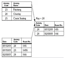 Les premières bases de données hiérarchiques sont apparues au début des années 1960. Les informations étaient découpées en deux niveaux de hiérarchie : un niveau contenait les informations qui sont identiques sur plusieurs enregistrements de la base de données. Le découpage a ensuite été étendu pour prendre la forme d'un diagramme en arbre[7].