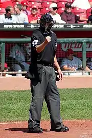 En baseball, l'arbitre (umpire en anglais) est la personne chargée du respect des règles pendant les matches. Lors des matches des années 1850, un seul arbitre positionné à côté de la première base dirige le jeu[49]. Cette méthode est abandonnée en 1858[49]. Deux arbitres, un en première base et l'autre au marbre, sont parfois utilisés de 1887 à 1912, date à laquelle la Ligue nationale adopte définitivement cette disposition[50]. Un troisième arbitre est introduit en 1933[50] puis un quatrième en 1952[50]. En Série mondiale, deux arbitres sont responsables du jeu jusqu'en 1908. Un troisième arbitre fait son apparition en 1909[50] puis un quatrième en 1910[50]. Six arbitres sont sur le terrain lors des Séries mondiales à partir de 1947[50] après une tentative avortée en 1925[50].