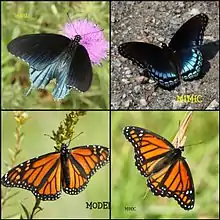 Alors que les imagos des espèces paléarctiques du genre Limenitis ont des apparences relativement homogènes, avec le dessus des ailes brun sombre ou noir orné d'une bande transversale blanche, les Basilarchia sont plus variables, avec plusieurs espèces s'écartant du motif commun. On pense que ces variations sont dues à des stratégies de mimétisme, qui ont catalysé l'évolution rapide des espèces nord-américaines[2]. L'apparence de Limenitis archippus rappelle ainsi celle de plusieurs Danaus dont Danaus plexippus (mimétisme mullérien), certaines sous-espèces de Limenitis arthemis imitent le Papilionidae Battus philenor (mimétisme batésien), tandis que Limenitis lorquini pourrait imiter Adelpha californica[3],[2].