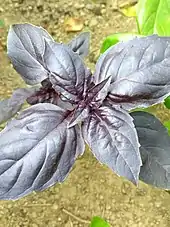 | Ocimum basilicum purpurascens | Basilic pourpre | Feuilles et tiges violacés. Fleurs rose pâle. Arôme légèrement poivré. De nombreuses autres variétés violacées existent. |
