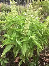| Ocimum basilicum var. thyrsiflora | Basilic thaï | Feuilles vertes, tiges et inflorescences pourpres. Saveur très épicée ressemblant à celle de l'estragon ou de l'anis. |