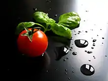 - L'huile essentielle de basilic (qui contient notamment, mais avec des proportions variant très fortement selon la saison[14] et selon la souche cultivée (chémotype[15]) et le lieu de culture divers composés phénoliques[16], du limonène[13] et du linalol[13], du copaène[17], du cinnamate de méthyle[18] et le 1,8-cinéole[18], de l'eugénol[11],[12], du méthylchavicol, le 1,8-cinéole, du trans-anéthol[19]) est produite par distillation à la vapeur d'eau des sommités fleuries de la plante.