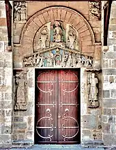 Au-dessus de la porte, dans le linteau en bâtière on peut reconnaître l'histoire de l'enfance du Christ : adoration des mages, présentation au temple, et baptême de Jésus, dans lesquels on retrouve des traces de polychromie ancienne. Au-dessus, dans un arc de décharge un Christ pantocrator est entouré par deux séraphins. Ses pieds reposent sur un lion et un taureau symbolisant les évangélistes Marc et Luc. En haut à gauche se développe une représentation de l'Annonciation (à gauche) et une Nativité (à droite).