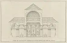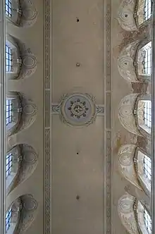 La nef centrale est couverte par une voute en berceau ornée de motifs végétaux et délimitée par des colonnes corinthiennes. Cette nef centrale est flanquée de bas-côtés qui comportent chacun une petite porte d'entrée côté ouest. Les bas-côtés, de même que le transept sont délimités par des arcs en plein cintre[19].